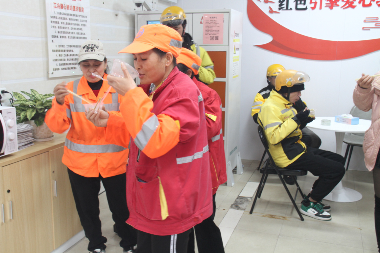 活动现场,工作人员设置了普法宣传台,为户外劳动者提供法律咨询服务,对广西职工医疗互助保障政策进行了详细解答,同时准备了热气腾腾的汤圆,并为户外劳动者送上慰问物资。