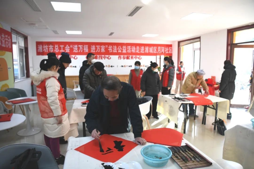 1月10日,山东省潍坊市总工会在月河社区开展“送万福 进万家”书法公益活动。活动现场,职工书法爱好者个个精神矍铄,挥毫泼墨,为职工群众书写了一副副充满喜庆与祝福的春联和“福”字。