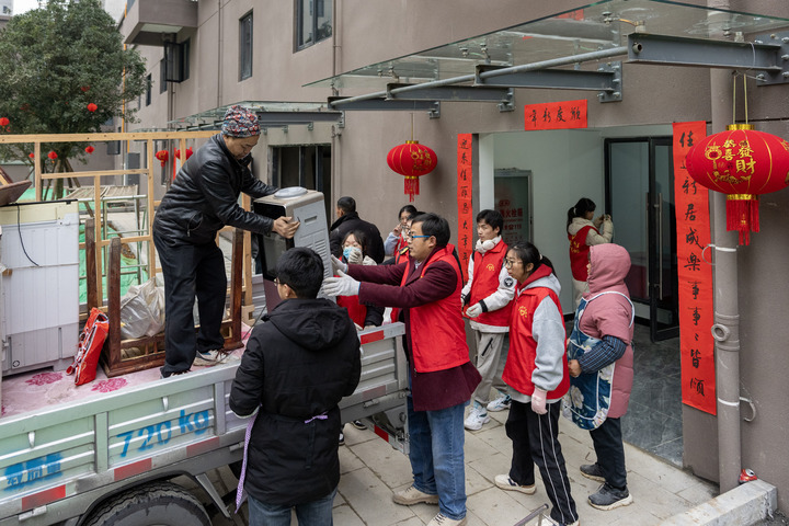 志愿者在雄俊园小区帮助受灾村民搬家。新华社记者 陈欣波 摄