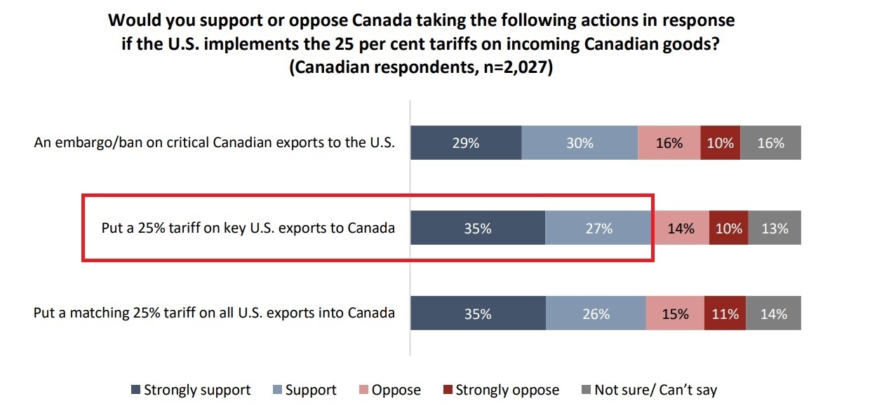 加拿大民意调查机构安格斯·里德研究所的最新民调结果显示,62%的加拿大人支持采取对等贸易报复措施,也就是对进口自美国的商品征收25%的关税。