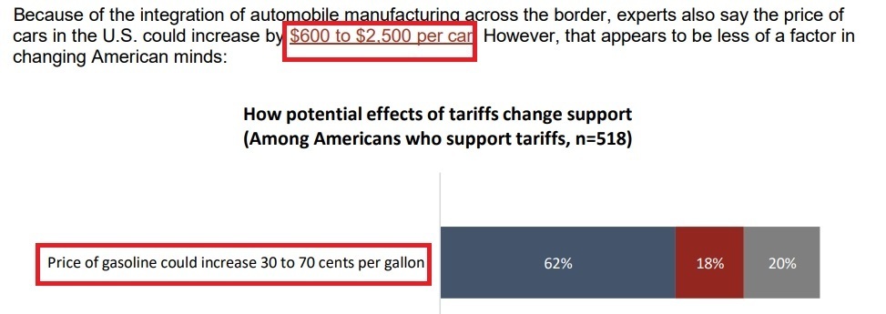 加拿大民意调查机构安格斯·里德研究所表示,对加拿大能源产品加征25%的关税,可能导致美国每加仑汽油价格上涨30到70美分,此外,每辆美国汽车的价格可能会上涨600美元到2500美元。