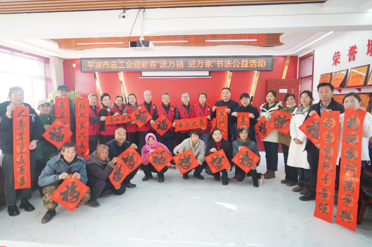 1月17日下午,甘肃平凉市崆峒区柳湖镇八里村职工书屋内,一场“送万福 进万家”义写春联赠送公益活动,拉开了2025年平凉市送温暖新春慰问活动的序幕。平凉市总工会邀请9位书法志愿者的书法老师书写春联和福字,为社区居民和环卫工人送上新春祝福。