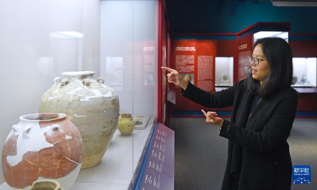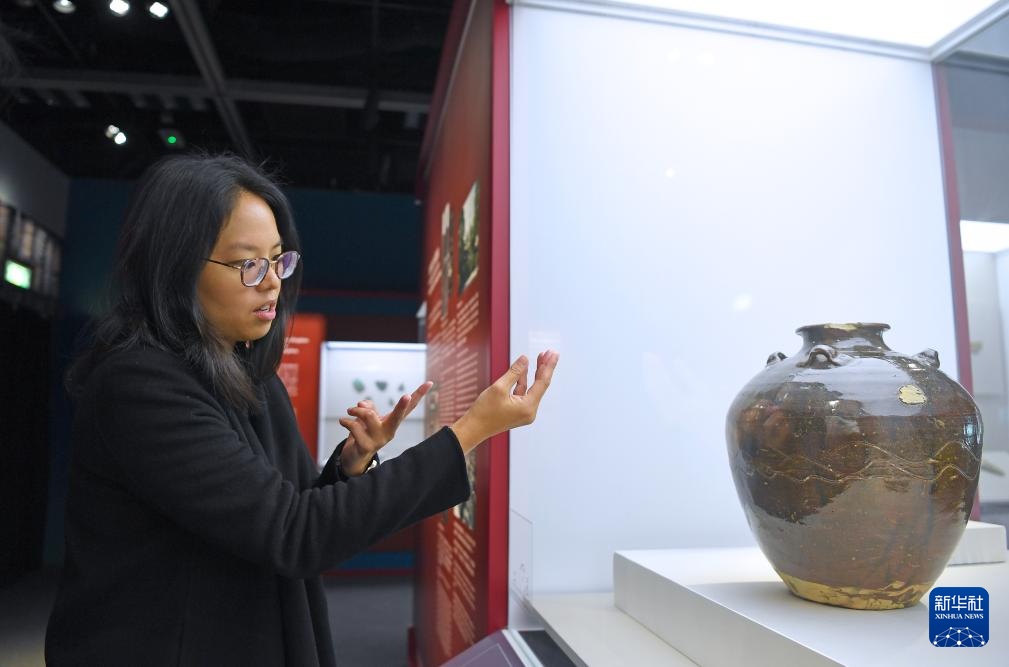 香港文物探知馆一级助理馆长李晓慧在讲解“从湾区启航:‘南海一号’与海上丝绸之路”展览上展出的南海窑酱釉“淳熙十年”印文四系罐(2024年11月28日摄)。新华社记者 陈铎摄