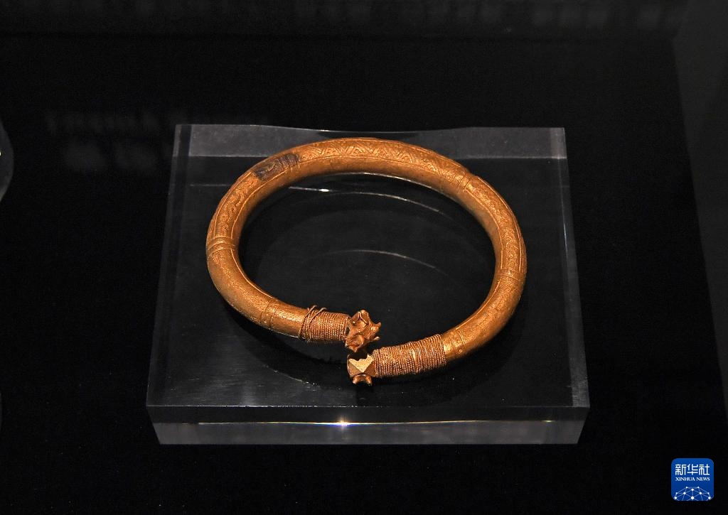 这是“从湾区启航:‘南海一号’与海上丝绸之路”展览上展出的镶宝石空心金镯(2024年11月28日摄)。新华社记者 陈铎摄