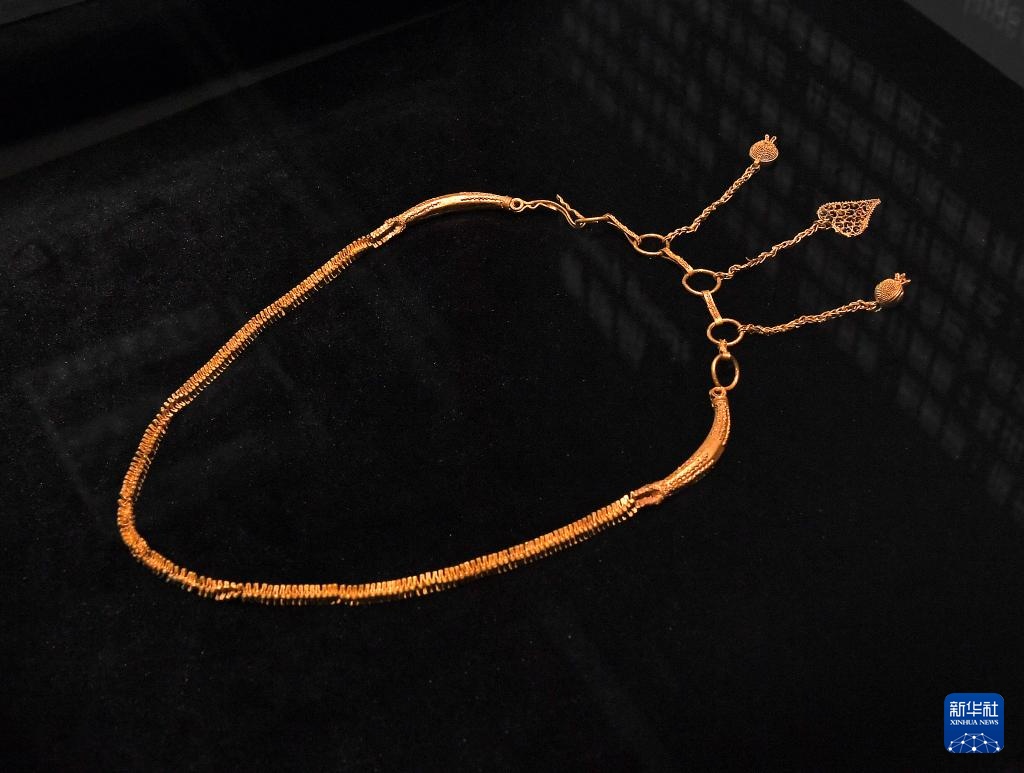 这是“从湾区启航:‘南海一号’与海上丝绸之路”展览上展出的金单顶链犀角形锥筒饰项链(2024年11月28日摄)。新华社记者 陈铎摄