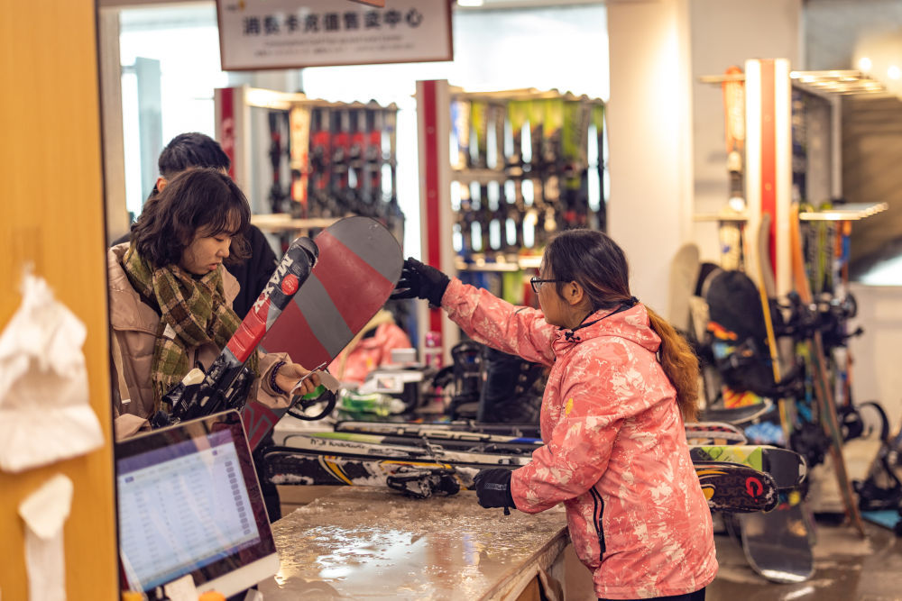↑1月18日,在重庆市南川区金佛山西坡滑雪场,游客在购买滑雪体验票。