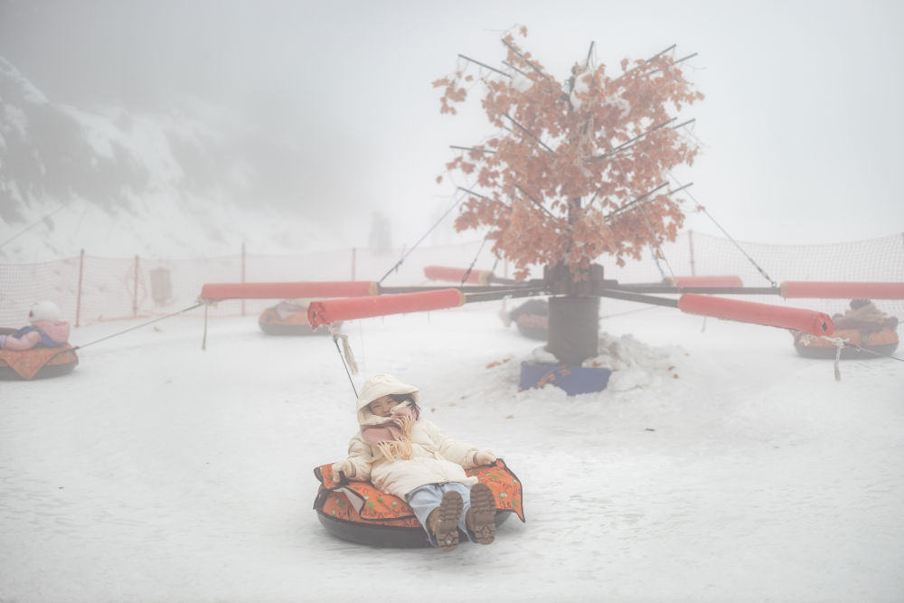 ↑1月18日,在重庆市南川区金佛山西坡滑雪场,游客在体验冰雪娱乐项目。