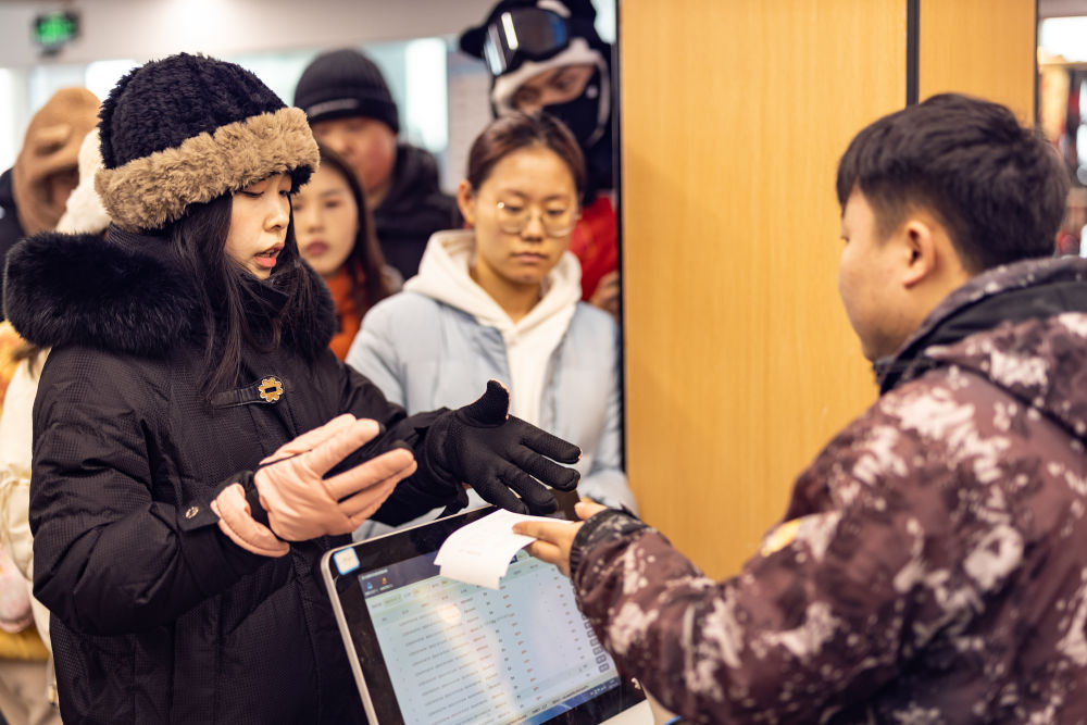 ↑1月18日,在重庆市南川区金佛山西坡滑雪场,游客在排队领取滑雪装备。新华社记者 黄伟 摄影报道