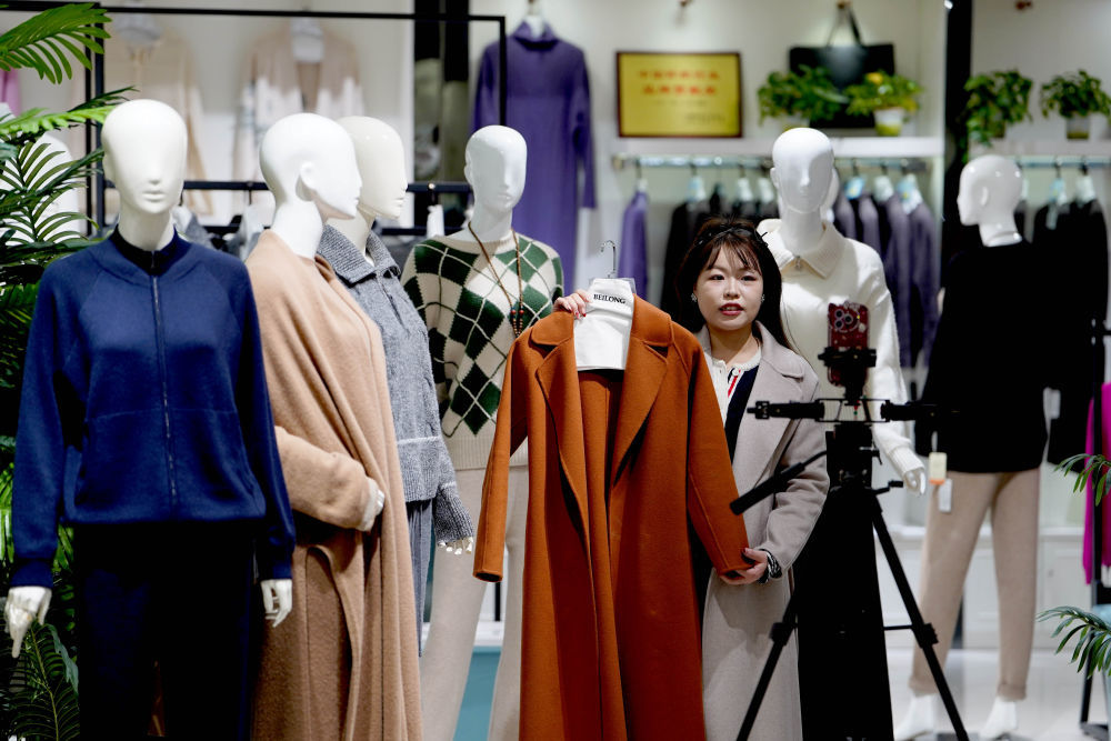 ↑1月18日,河北省邢台市清河县一家羊绒制品销售门店的员工在直播平台上推介羊绒产品。