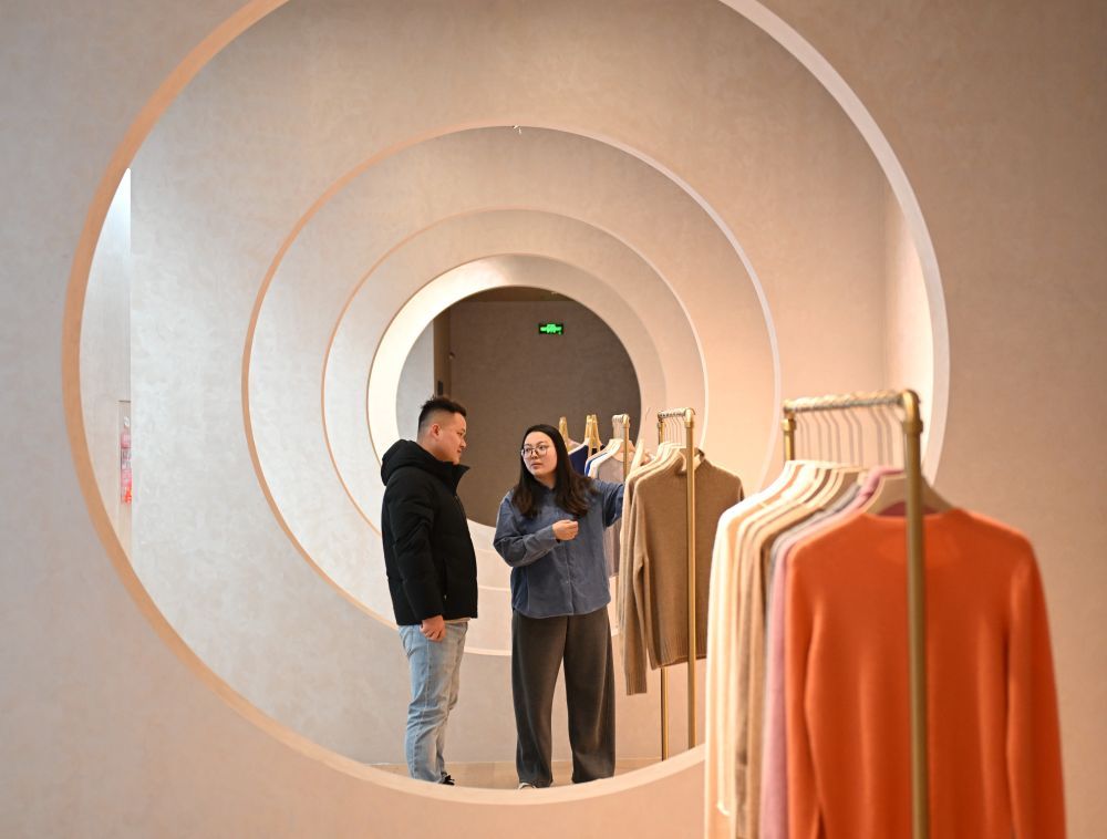 ↑1月18日,河北省邢台市清河县一家羊绒制品生产企业的员工在展厅内整理羊绒外套。新华社记者 牟宇 摄影报道