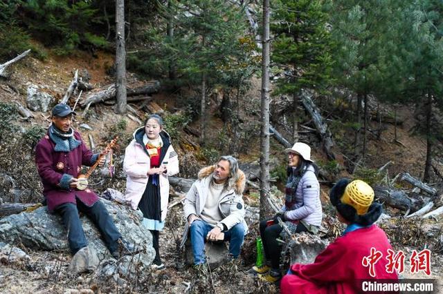 2025年1月6日,林登夫妇(左三、左四)在云南省迪庆藏族自治州德钦县奔子栏镇玉杰村,与村民徒步、休憩。中新社记者 李嘉娴 摄