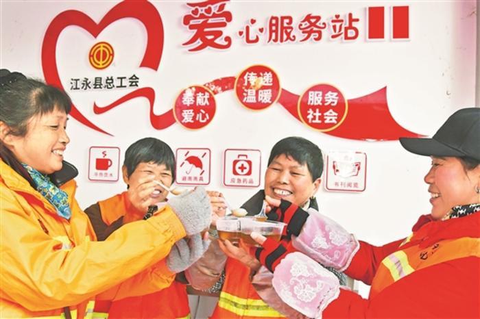 近年来,江永县充分发挥工会优势,形成“社区服务阵地+爱心服务站”“商圈企业+爱心服务站”等“服务站+”建设模式,为快递员、外卖配送员、环卫工人等户外劳动者提供便利歇脚地。