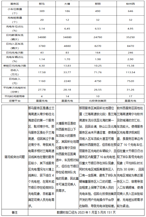 兰海高速(南钦防、钦北段)起于南宁,途径钦州、防城港、北海三市,全长近337公里,于上世纪90年代起陆续通车,是广西北部湾经济区的骨架公路,在国家高速公路网中具有十分重要的地位和作用。因其培育时间较长,车流较大(截至2023年5月,日均总车流达14.11万辆次),对新能源汽车充电的需求较为旺盛。具体见表2。