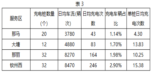 由上表可知,钦州西与那丽服务区充电桩数量相同,车流相近,但充电次数相差较大,充电率相差近1个百分点,单桩日均充电次数也相差5次。据了解,钦州西服务区日常充电需求基本满足,但在周末及节假日充电资源较为紧张,甚至在重大节假日需要排队取号充电;那丽服务区除重大节假日存在一定的排队充电情况外,完全满足日常的充电需求,那马与大塘服务区充电情况与那丽服务区类似。因此根据上表数据分析,以那丽服务区为参照,对于2021年及以后建设充电桩的服务区(单侧仅4个充电桩的服务区除外,那马与大塘服务区因建设时间较早,各有一侧服务区仅有4个充电桩,已存在充电资源紧张的风险),若日均充电车流占日均入区车流的比重达到约2%且单桩日均充电次数在10次以上的,则可研判该服务区是否需要进行充电桩加密。