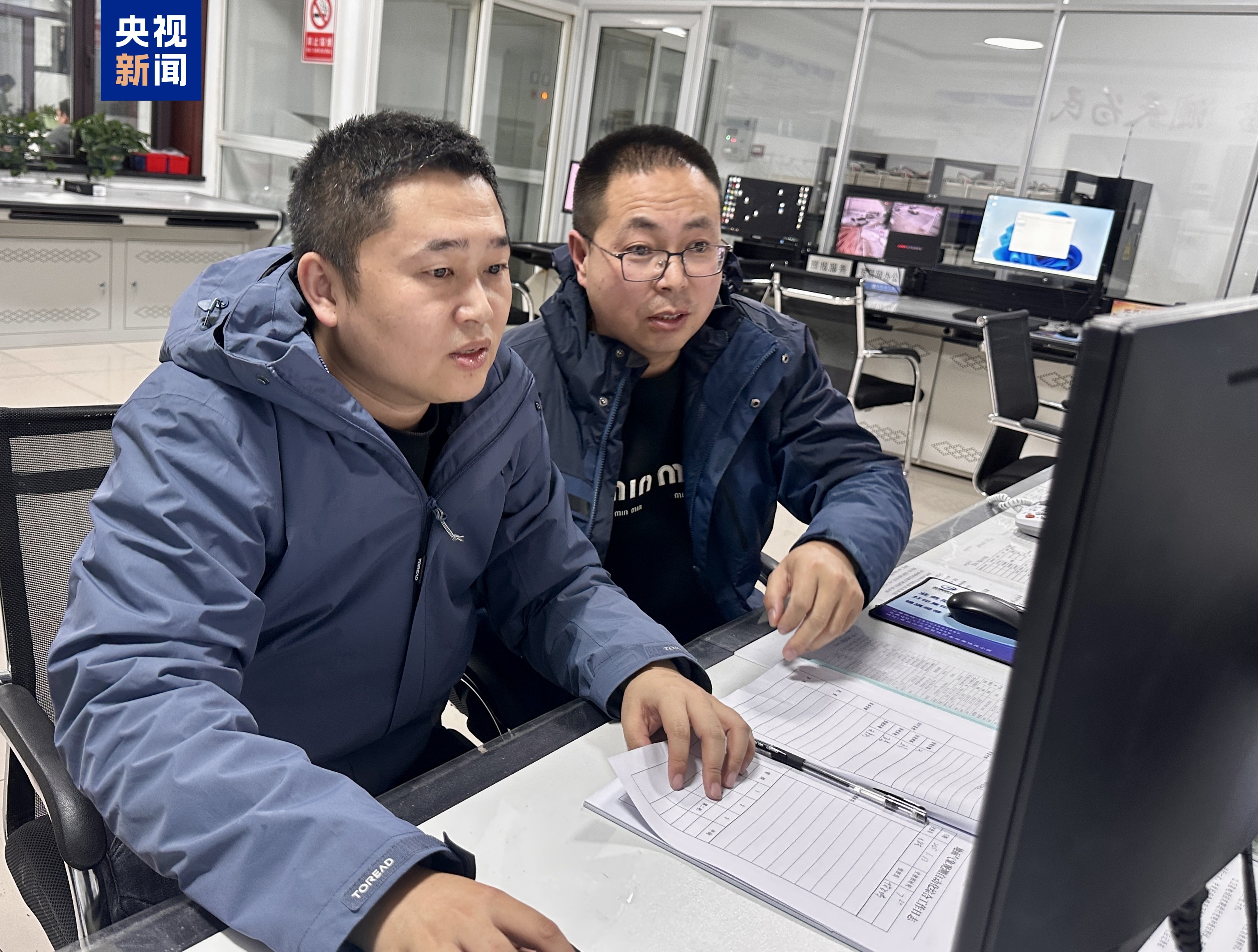 △杨飞鸿(左)与王俊杰(右)查看春运气象数据