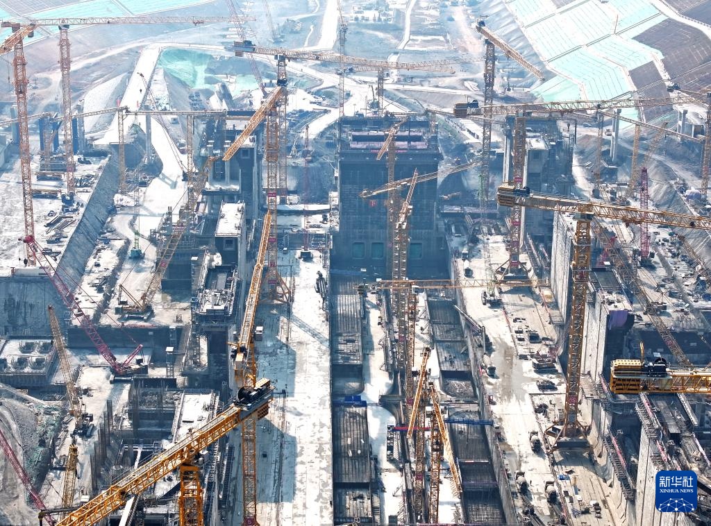 1月21日,工人在平陆运河建设现场进行护坡施工(无人机照片)。新华社记者 周华 摄