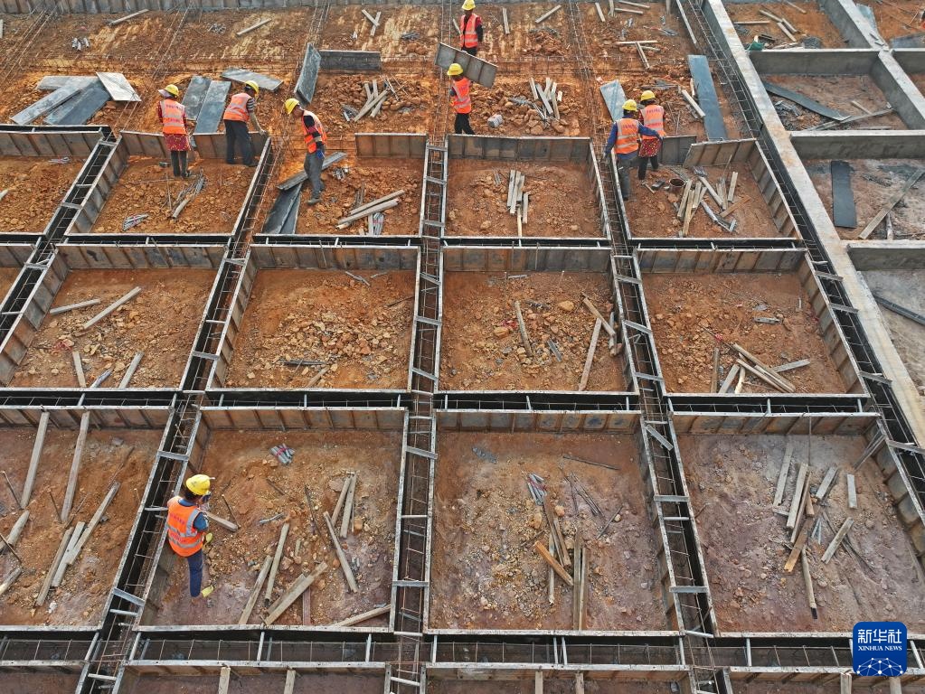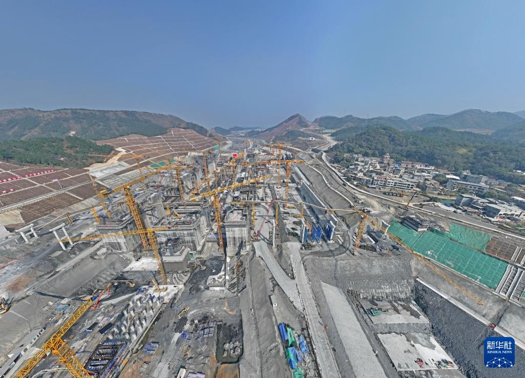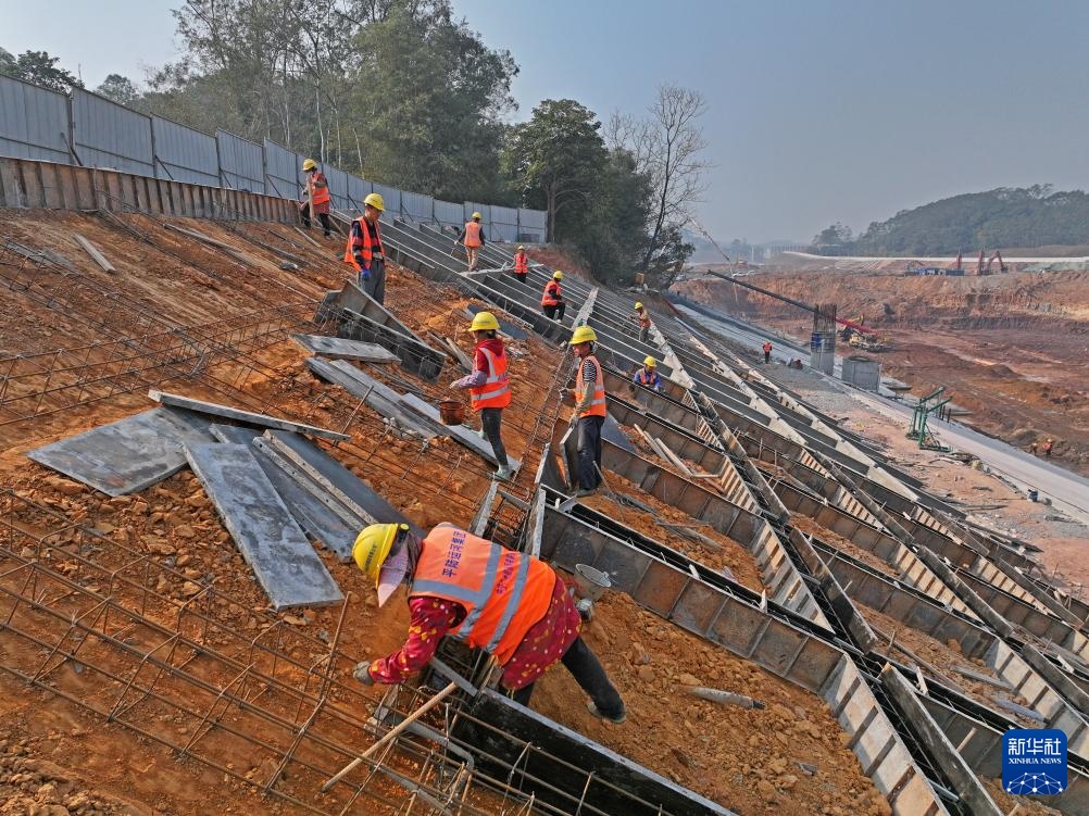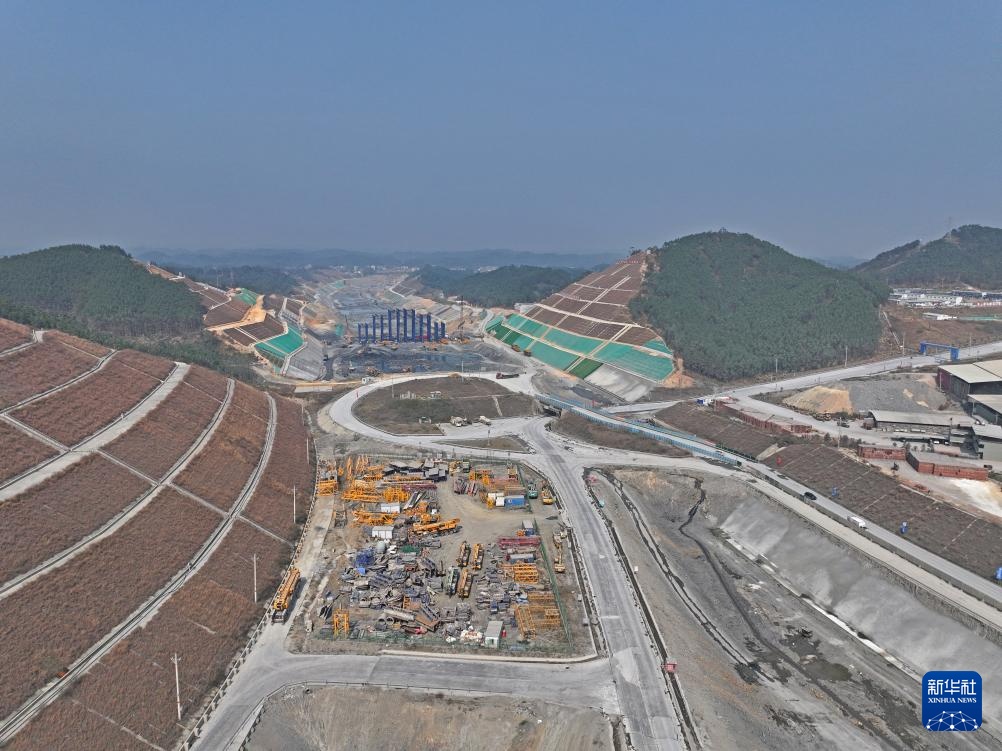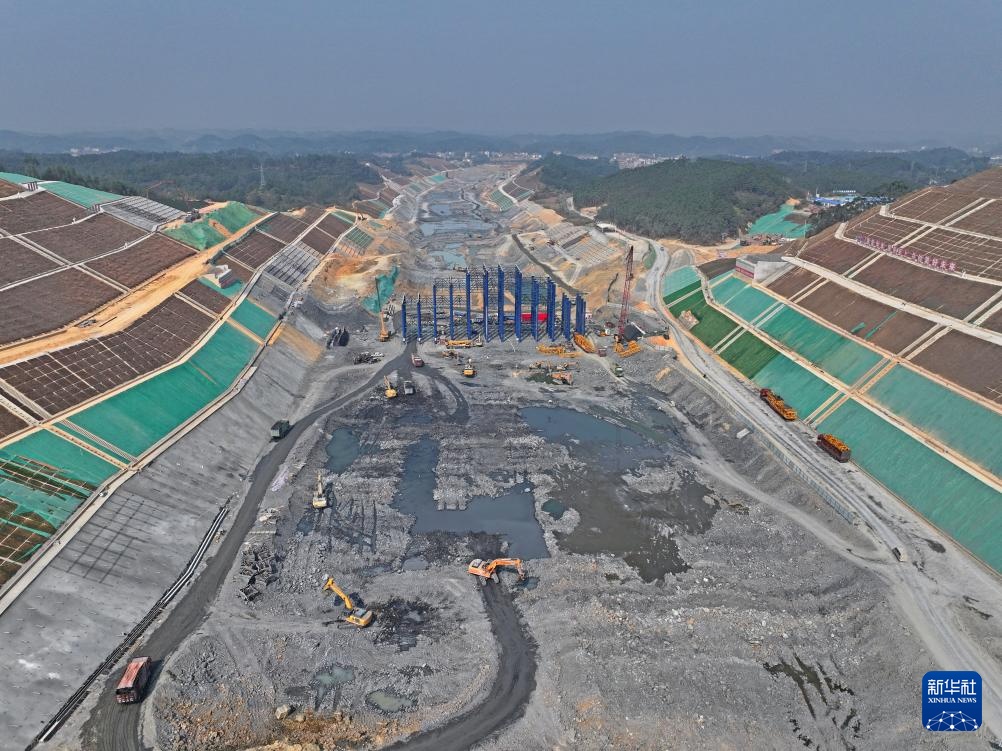 这是1月21日拍摄的位于广西钦州市灵山县旧州镇的平陆运河马道枢纽建设现场(无人机照片)。新华社记者 周华 摄