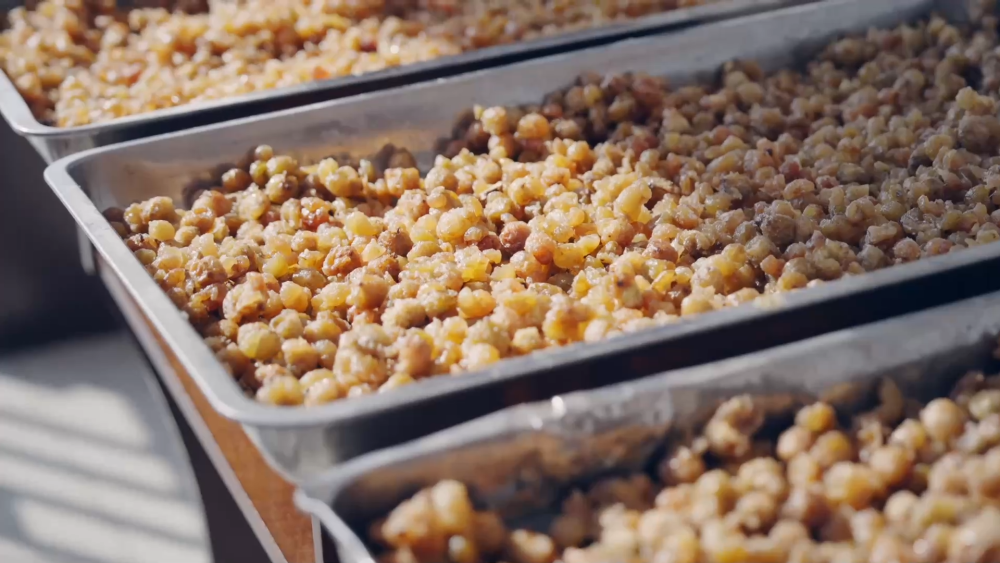 在此期间,糖分慢慢渗透进果肉,酸味逐渐被中和,待糖分与果肉完全融合后,村民将橄榄果肉摊开,置于阳光下晾晒,直至水分蒸发,晶莹如琥珀般的橄榄糖便制作完成。