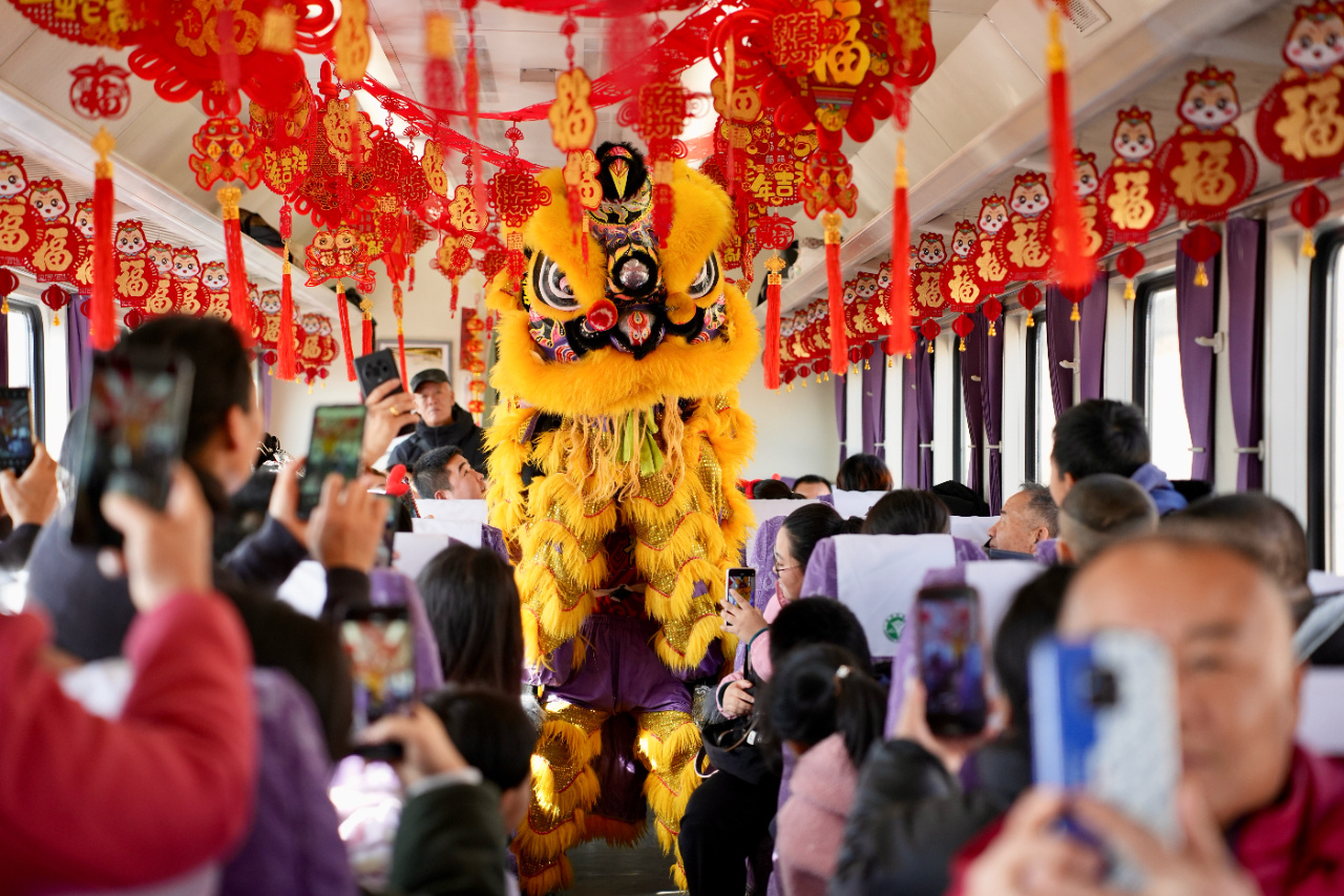 11时10分,列车缓缓驶离白银西站。伴随着一阵欢快激昂的开场锣鼓声,活灵活现的舞狮表演闪亮登场,时而摇头摆尾,时而直立起身,时而憨态可掬,引得车厢内旅客们纷纷鼓掌喝彩,欢声笑语此起彼伏。
