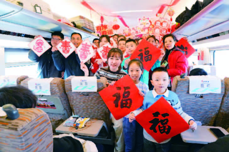 天津西站开往香港西九龙站的G305次列车上张灯结彩,工作人员现场写春联、“福”字送给旅客,让旅客们感受到浓浓的年味儿。张磊 摄