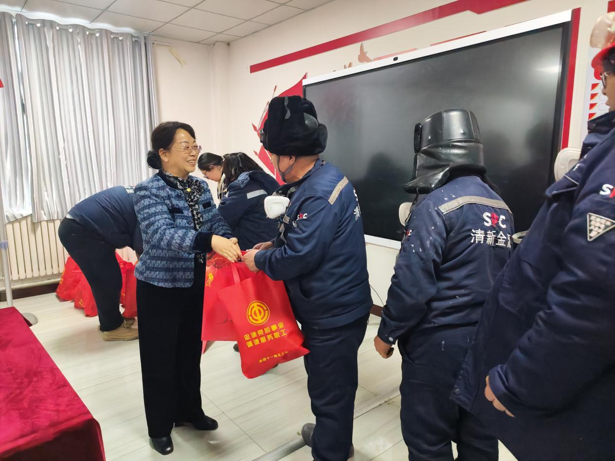 1月21日下午,接过新疆生产建设兵团第十一师总工会主席刘瑛送上的“新春大礼包”,新疆金派环保科技有限公司工会主席马义春不停致谢。当天,兵团第十一师总工会工作人员携带装满保温杯、护手霜、洗发水等日用品的“新春大礼包”,为金派环保科技有限公司的143名一线职工送上总价值达28600元的慰问品。