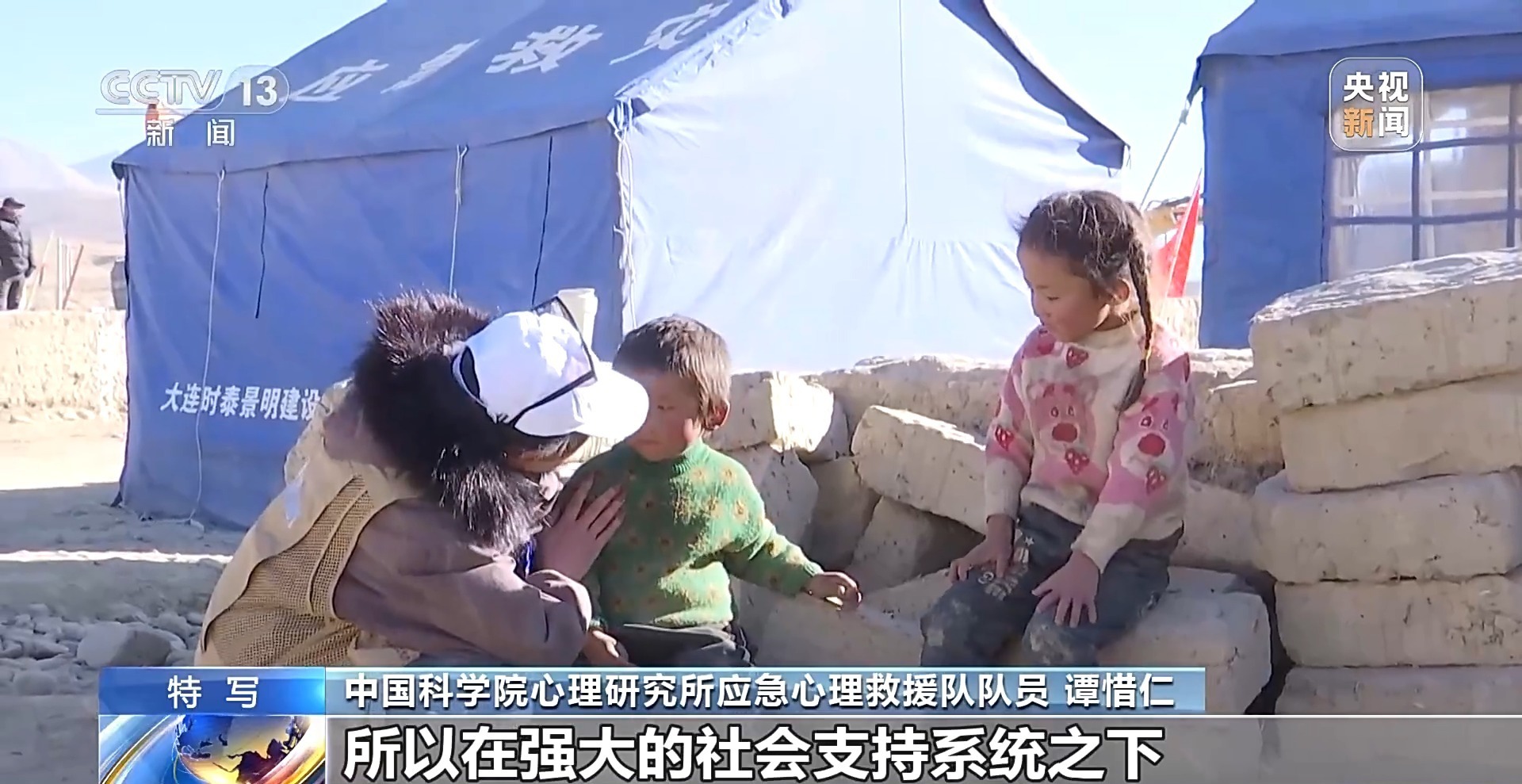 中国科学院心理研究所应急心理救援队队员 谭惜仁:我来了以后发现,仅仅两天的时间,我们的物资已经到位,所有的帐篷都搭好了。所以在强大的社会支持系统之下,我们有了爱和安全感,我相信孩子们包括他们的家人就会在心灵重建的路上会走得更好一些,更顺畅一些。