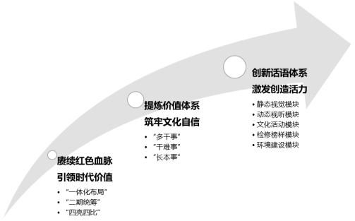 长江电力勇攀文化建设通过铸魂、筑家、塑形、聚力四个步骤,充分发挥文化引领力、凝聚力、塑造力、辐射力,实现价值统领精神态度、价值驱动品质追求、价值引导自我要求、价值赋能理想目标,由内而外依次构建勇攀精神文化、制度文化、行为文化、物质文化,为推动安全绿色高质量发展提供思想保证、精神动力、智力支持和品牌保障。