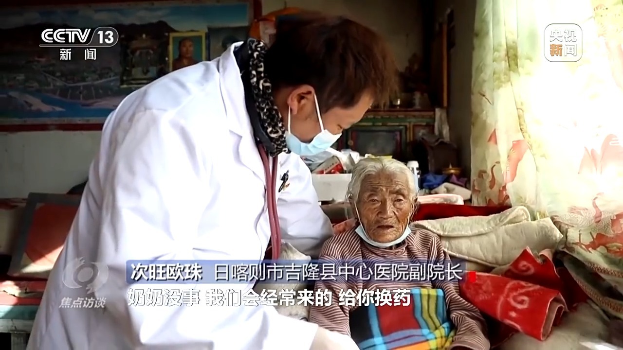 对于特殊人群、重点对象,医护人员都会上门问诊。长所乡茶江村95岁的奶奶次仁仓在地震中手腕受伤,医护人员们每天上门为她换药。
