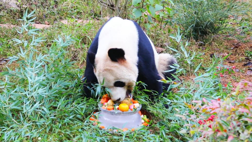 春节将至,云南野生动物园的大熊猫保育员们给大熊猫毛竹和珍多提前准备了年夜饭。在簸箕中放置冰蛋糕、窝窝头,周围撒上胡萝卜、小番茄、苹果、人参果等蔬果,再用竹叶进行点缀,便是毛竹和珍多的年夜饭。为督促其运动,保育员还在树枝上、玩具内放置了胡萝卜块和苹果块。