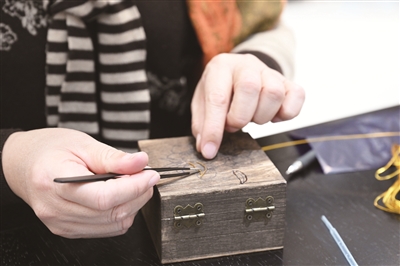 在原木制作的过程中,曹玉清不断发现新的美好。前不久,她在制作原木首饰盒时发现首饰盒表面没有装饰不够美观,思来想去,觉得如果用颜料细抹、再用色彩绚丽的掐丝珐琅装饰一下会更漂亮。于是,曹玉清大胆地尝试了掐丝珐琅的制作,谁知道这一下子,她就“玩上瘾”了。