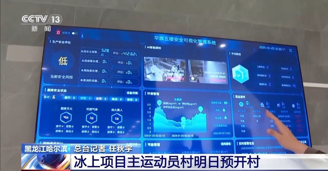 总台记者 任秋宇:在华旗饭店运动员村的餐厅当中,我们发现了一套可视化管理系统,那这套系统是用AI感知来检测厨房当中的一些异常信息,比如说口罩检测、厨师帽检测和厨师服检测等。除此之外,屏幕上还有菜品留样的信息,同样还有节能管理、风险事件统计。有了这套可视化管理系统,可以更好地保证赛事期间运动员的饮食安全。