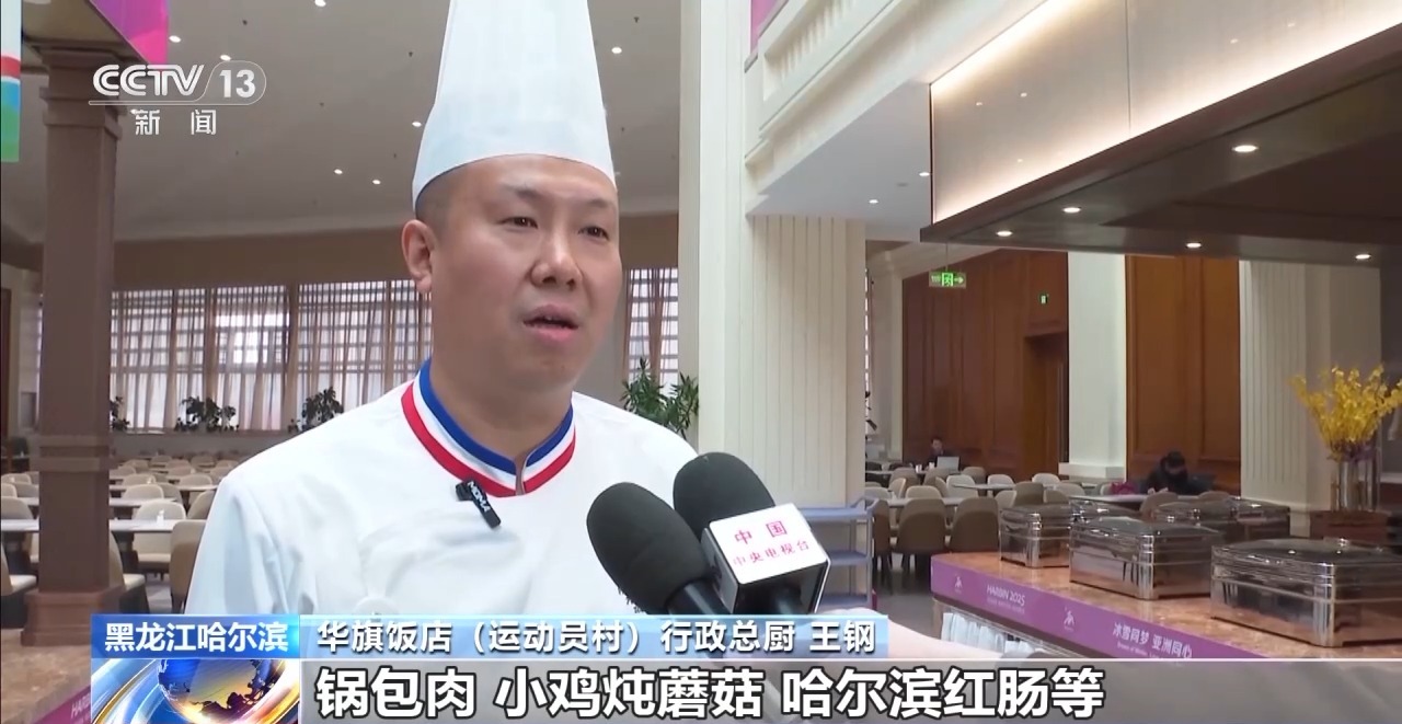华旗饭店(运动员村)行政总厨 王钢:我们在菜单制作上采用有营养丰富的西餐,如牛排、意大利面等;有独特风味的东南亚及次大陆菜品;还有美味营养的中餐等,像本地的食材锅包肉、小鸡炖蘑菇、哈尔滨红肠等,为运动员在高强度的比赛或训练时提供营养需求。