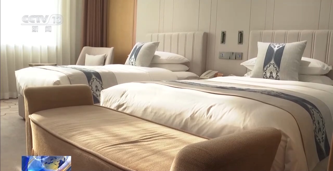 华旗饭店(运动员村)客房部经理 陈瑾:这是我们为运动员准备的标间,里面配备的是两张1米2乘2米的床,根据运动员身高的不同,我们准备了床榻对床进行了加长。