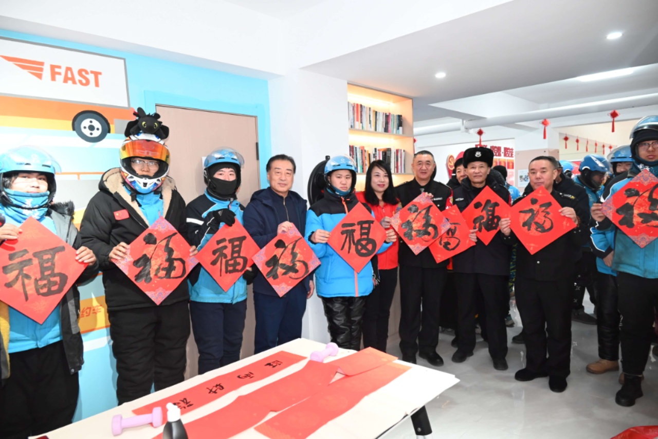除了暖心的物资,沈阳市铁西区总工会精心策划的“送万福,进万家”书法公益活动也成为当天的一大亮点。活动特别邀请了铁西区书法家,现场挥毫泼墨,书写新春福字。书法老师笔锋游走间,一个个饱含祝福的“福”字跃然纸上,墨香四溢。新就业形态劳动者围在桌前,挑选着心仪的福字,有的还迫不及待地和写好的福字合影留念,镜头里满是他们质朴又满足的笑容,现场气氛热烈又温馨,墨香与欢声笑语交织在一起,满是浓浓的年味。