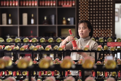 陕西云集柿业有限公司的工作人员正整理货架上的柿子酒产品。记者 李一博 摄