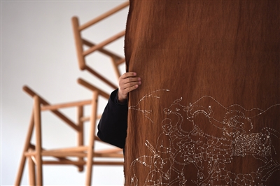 在位于渭南市富平县的中国柿染艺术馆,参观者查看一块柿染布料。记者 李一博 摄