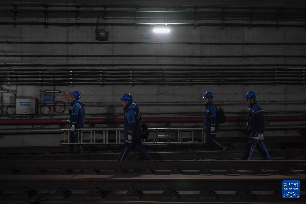 1月26日凌晨,成都地铁北郊接触网2班工作人员扛着梯子前往作业点。新华社记者 胥冰洁 摄