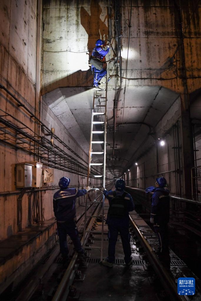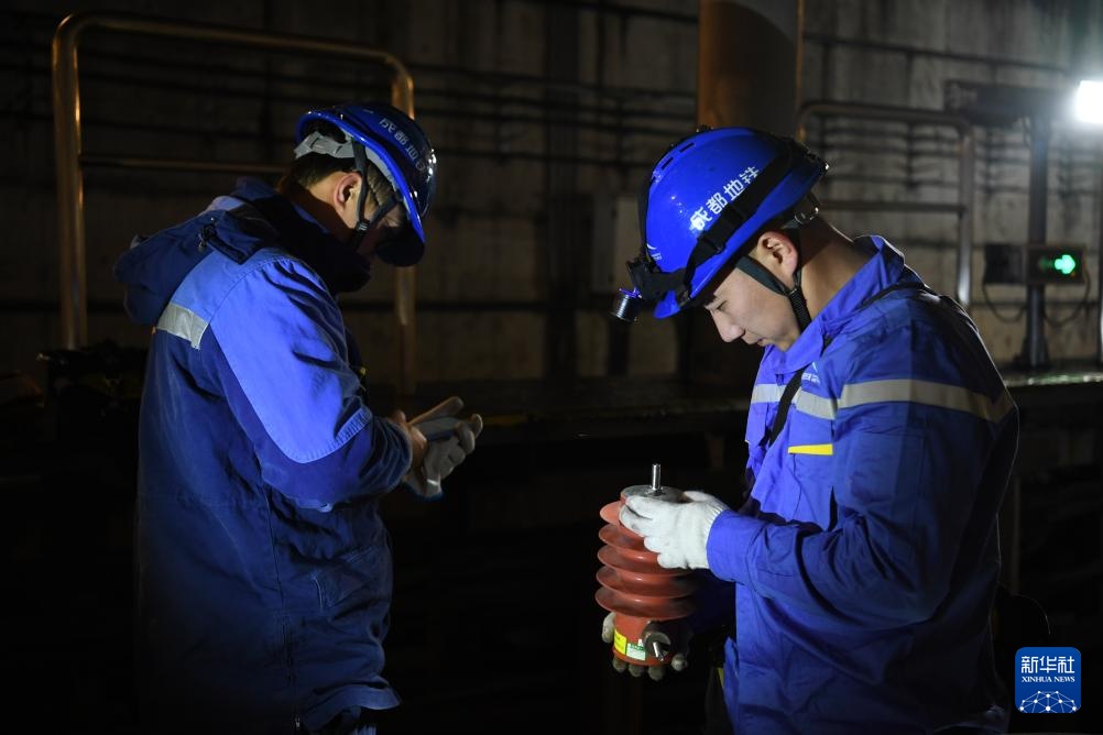 1月26日凌晨,成都地铁北郊接触网2班工作人员在地铁隧道外更换避雷器。新华社记者 胥冰洁 摄