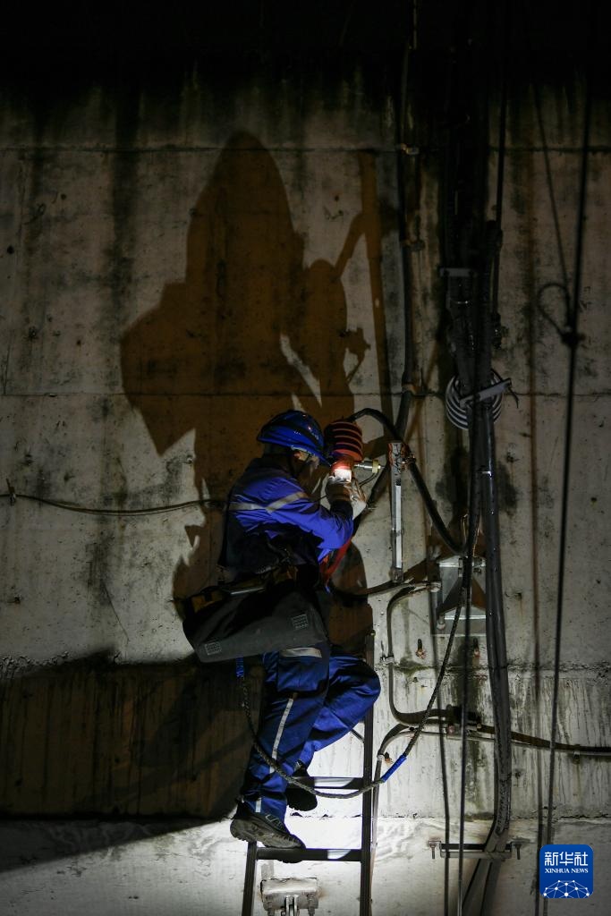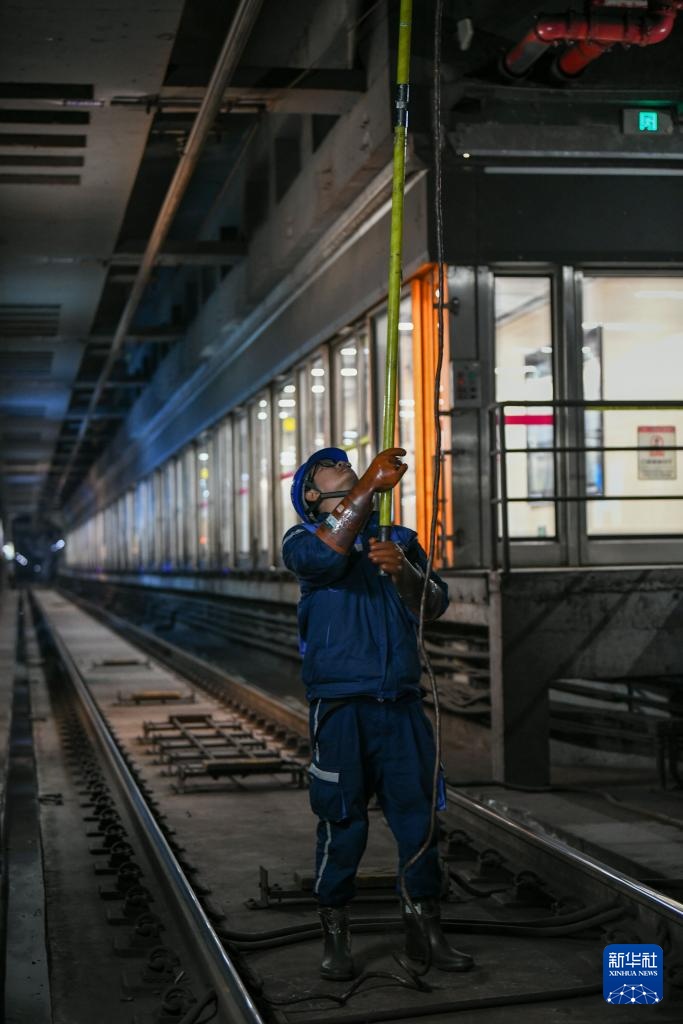 1月26日凌晨,成都地铁北郊接触网2班工作人员杨力在挂接地线。新华社记者 胥冰洁 摄