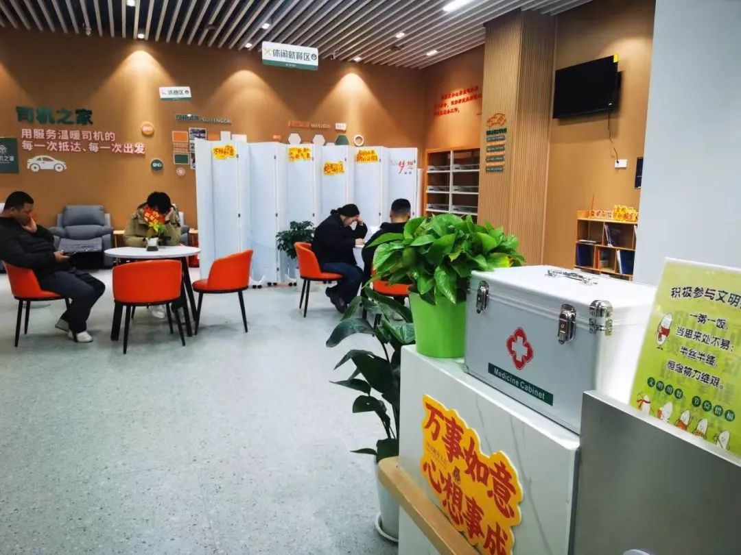 “司机之家”建筑面积186平方米,内设休息区、服务台、综合咨询区、党建服务(会议培训区)四个功能区块。宽敞明亮的休息区内,配备了电动沙发、微波炉、冰箱、茶几和饮水机等,可供往来司机临时休息和饮水。墙上一个个温馨的标语,则提醒着司机们要时刻注意安全驾驶。