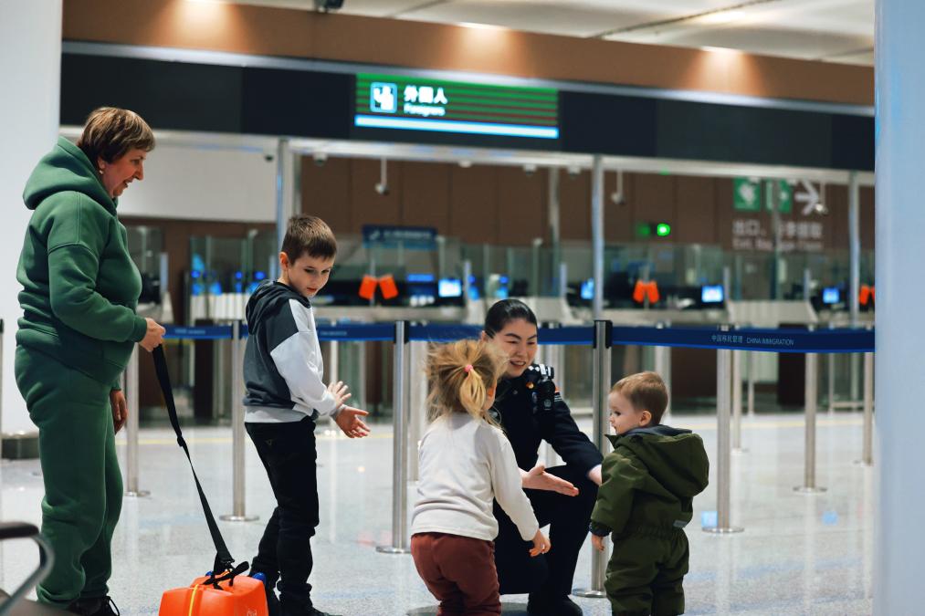 俄罗斯玛莎一家,申请了临时入境许可,在北京中转。看到一行有三个孩子,孙丽静主动上前服务,为孩子们倒上温水解渴,陪他们玩耍。