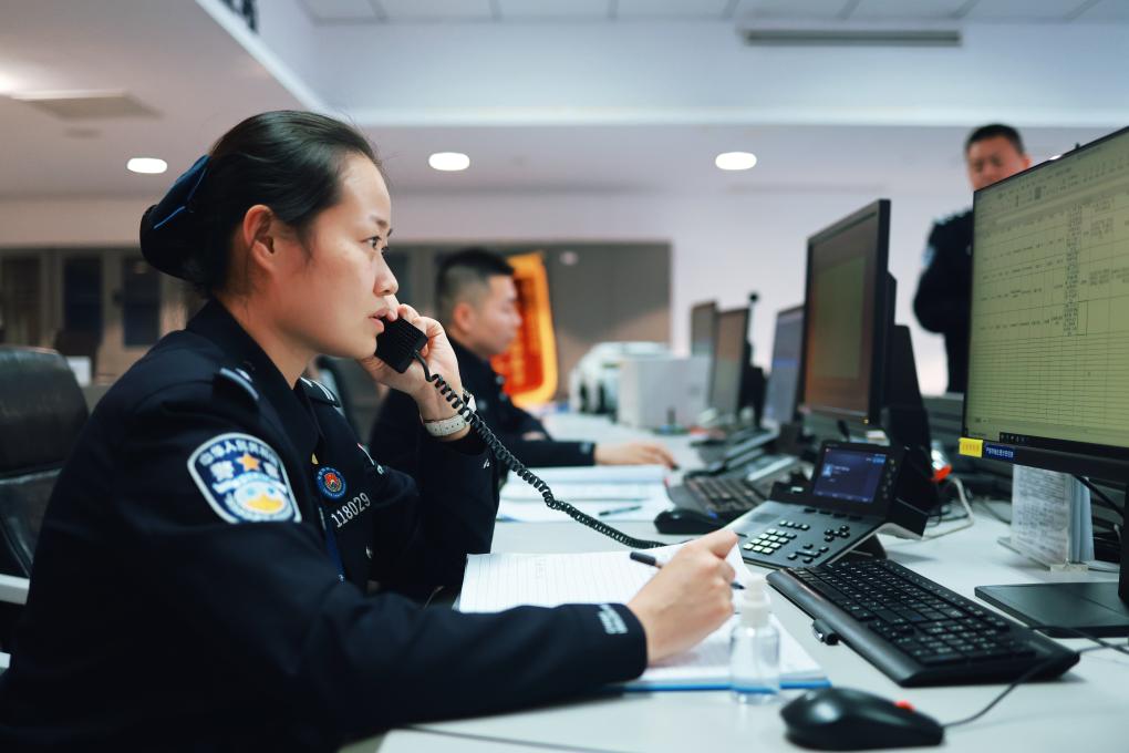 指挥中心,民警李思雨在接听电话。新华社记者 任沁沁 摄