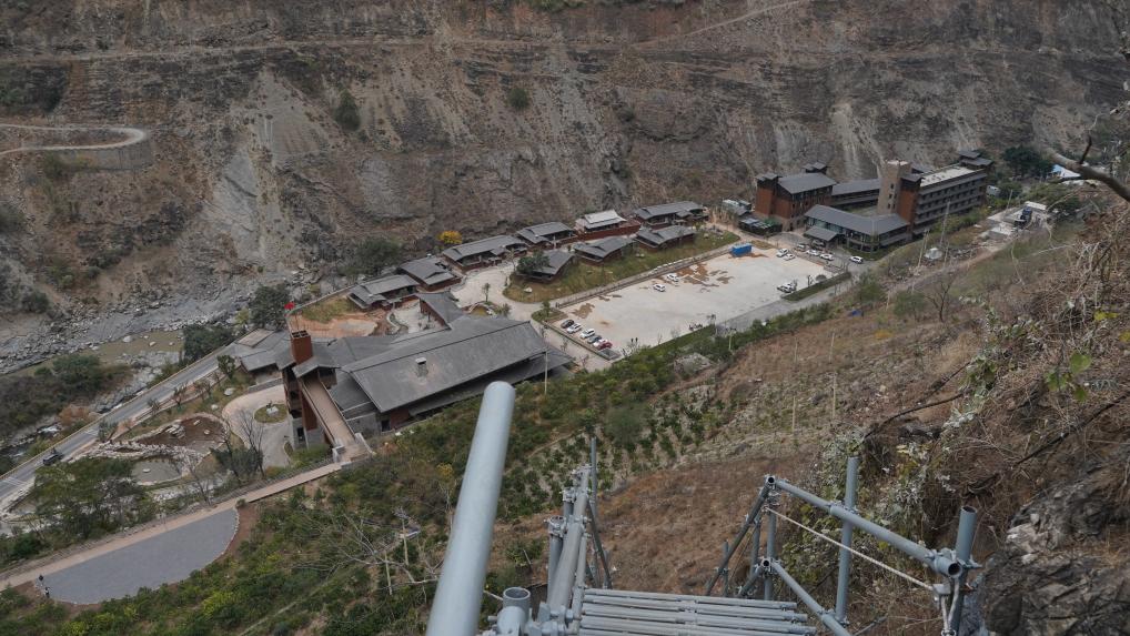 站在钢梯上俯瞰悬崖村“天空之谷”景区的酒店、民宿等设施。新华社记者 尹恒 摄