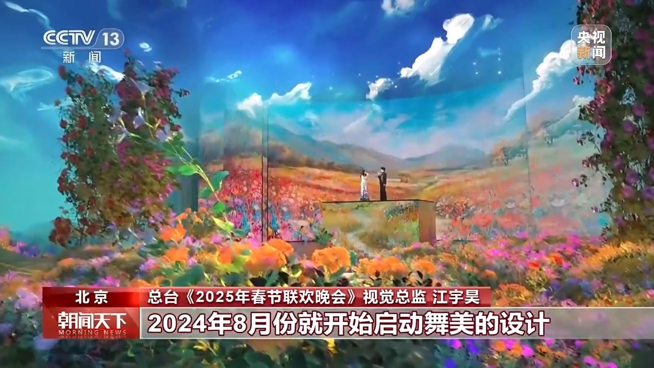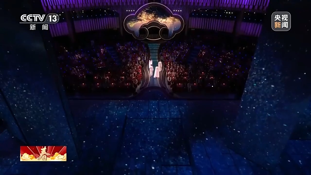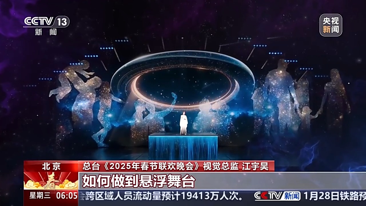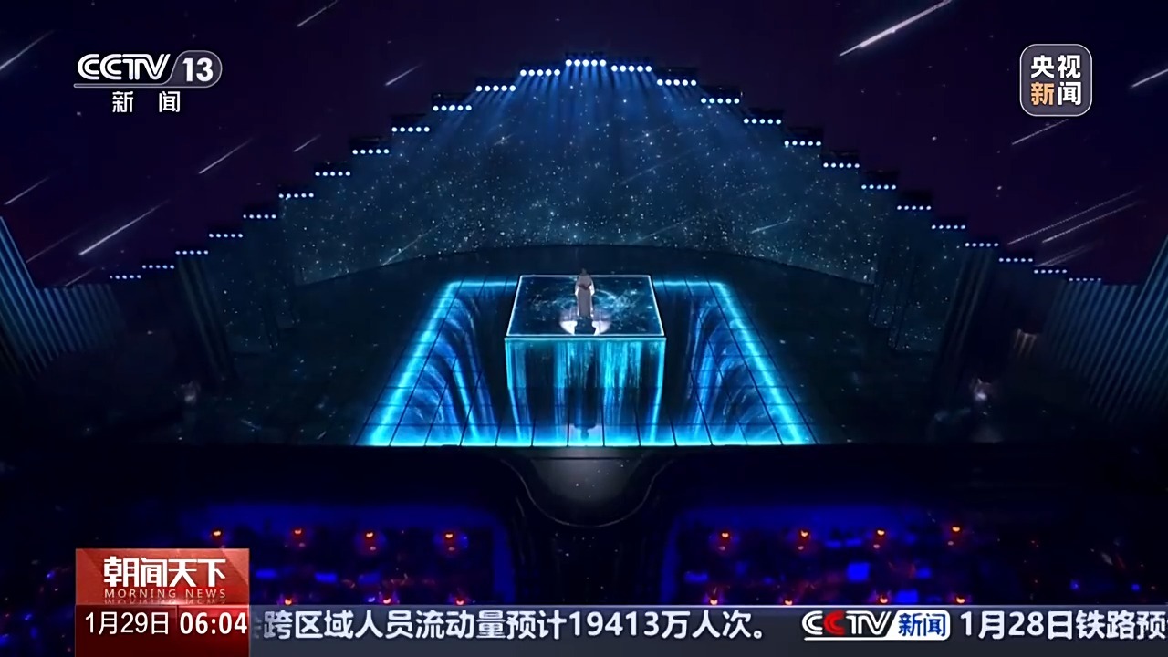 总台《2025年春节联欢晚会》视觉总监 江宇昊:对于春晚的视觉呈现来说,每年都必须要有一定的创新。在一号厅有限的物理空间中,我们要做到更多形式的突破。大家看到今年我们在主舞台上的创新部分,就是将一个5米×5米×4.5米的大的立方的升降系统,替换了以往那种单条1米×1米的小间距升降系统。似乎不是那么大的变动,其实它的难度是一个指数级增长,我们前前后后反复论证了一个多月的时间。像《世界赠予我的》,拿到这个题目,第一瞬间就想到一定要做一个银河空间的悬浮舞台。如何做到悬浮舞台?只有依托“5×5”完整的视觉空间,让地屏一半的影像呈现一个舞台,另外一半影像和地屏的空间做结合,才能形成悬浮空间。