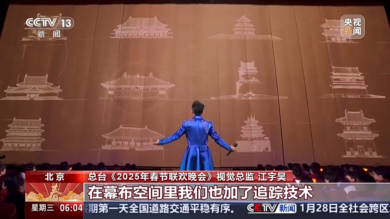 总台《2025年春节联欢晚会》视觉总监 江宇昊:升降条幕是由单个1平方米的条幕,构成整个横跨30米的大型幕布空间。在幕布空间里我们也加了追踪技术实施的遮罩追踪技术,可以跟随着幕前幕布的升降来调整画面的遮罩,使得画面和幕布的升降得到非常好的匹配。