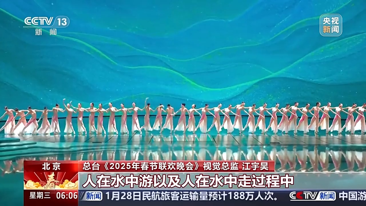 总台《2025年春节联欢晚会》视觉总监 江宇昊:我们努力地想做到人在水中游以及人在水中走过程中划开的涟漪、划开的水线极致化的展现。舞蹈是一个肢体语言的艺术,对于视觉来说,我们需要观众看到第一个画面的时候,能帮助他们理解舞蹈的意义和舞蹈的内涵,所以大家能看到在第一个画面中,一滴水滴缓缓地落下,在虚拟空间中水滴散出水波,叠加到舞蹈演员肢体上后,通过实时追踪技术又散发出来水波。结合了光影艺术、视觉艺术以及各种现代的追踪技术,来完成了一场更具有现代气息的艺术表演,让传统文化焕发出新鲜的生命力,让更多的朋友去了解到中国传统文化的魅力。