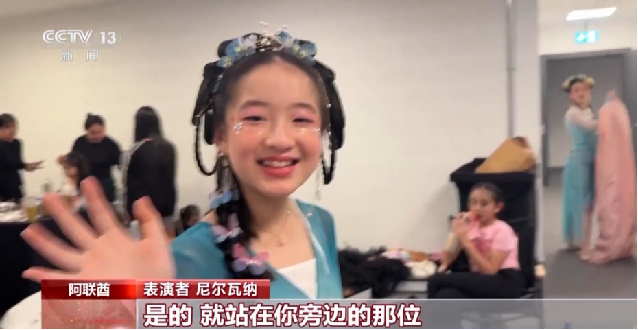 表演者 尼尔瓦纳:你好,我是尼尔瓦纳,我很高兴能够参与春节演出的表演。因为我觉得春节非常独特,有非常传统的服饰,就像我现在穿的这一套。我也很喜欢她们的发型和妆容,我真的很喜欢一切。而且我在这里认识了很多中国人,所以学了一点中文,比如“你好”“你好吗”“我很好”还有“谢谢”。我真的很喜欢中国文化。