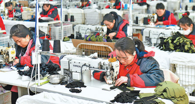 山东嘉祥县,工作人员在济宁全成手套有限公司生产车间缝制滑雪手套。新华社记者 郭绪雷摄
