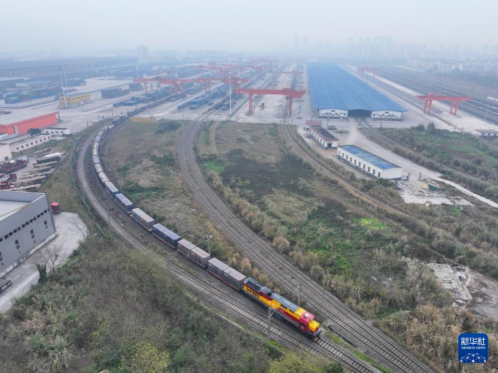 1月29日,农历新年重庆地区首趟中欧班列在重庆团结村站顺利发车(无人机照片)。新华社记者 唐奕 摄