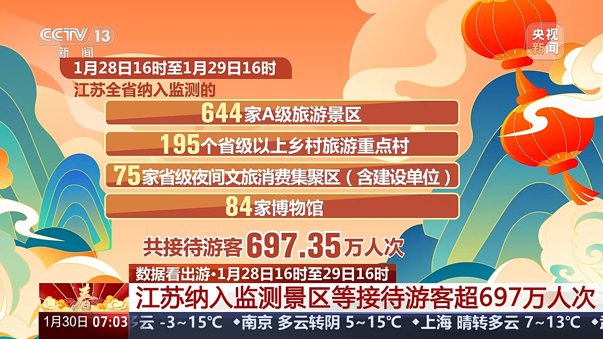 据江苏智慧文旅平台监测:1月28日16点到29日16点,全省纳入监测的644家A级旅游景区、195个省级以上乡村旅游重点村、75家省级夜间文旅消费集聚区(含建设单位)和84家博物馆共接待游客697.35万人次。